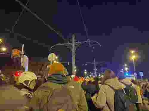 A Kossuth téren hivatalosan véget ért az esemény. Kötelező volt elmondaniuk, hogy mindenki menjen haza, ettől függetlenül megkértek minket a szervezők, hogy békésen gyülekezzünk a továbbiakban is. A menet elindult a Margit-hídhoz, ahol becsatlakoztunk a másik tüntetéshez, itt már egy lezárt híd fogadott minket, rendőrsorfallal, villogó rendőrautókkal.