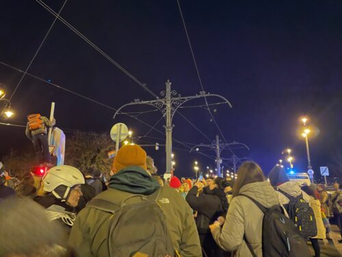 A Jászai Mari téren – bár volt, aki lámpaoszlopra mászott fel – összességében békésen álldogált a tömeg a sorfal előtt, többen skandálták, hogy “engedjetek át!”. Ennek több járókelő/futó is örült volna, de senkit semmilyen indokkal nem engedtek át.
