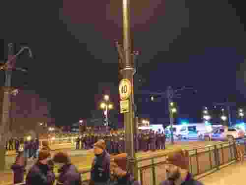 A Kossuth téren hivatalosan véget ért az esemény. Kötelező volt elmondaniuk, hogy mindenki menjen haza, ettől függetlenül megkértek minket a szervezők, hogy békésen gyülekezzünk a továbbiakban is. A menet elindult a Margit-hídhoz, ahol becsatlakoztunk a másik tüntetéshez, itt már egy lezárt híd fogadott minket, rendőrsorfallal, villogó rendőrautókkal.