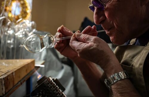 Vagy úgy is mondhatnánk: AZ üvegmanufaktúrát Tárnokon, ahol Szabóék őrzik ennek a szép mesterségnek a hagyományait. Minden díszük kézzel készült, és karácsony előtt megnyitják a műhelyt a nagyközönségnek is: https://szabouveg.hu/munkafolyamatok