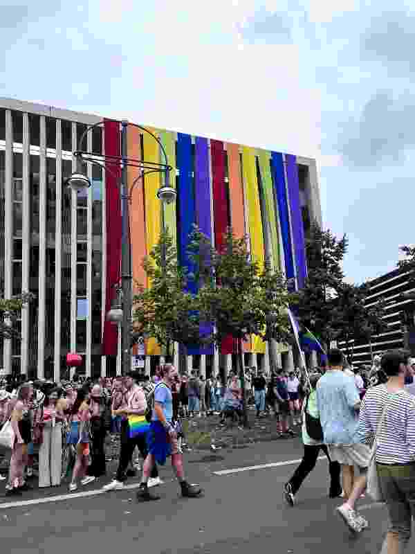 The whole city seemed to be preparing for Pride, and it was not seen as a “problem” of one group, it was not seen as everything getting closed down because of ‘them queers’. In fact, they had already dressed up anything they could in rainbows: logos, shop windows, every public building had something added to its facade, and many institutions had put up rainbow flags.
