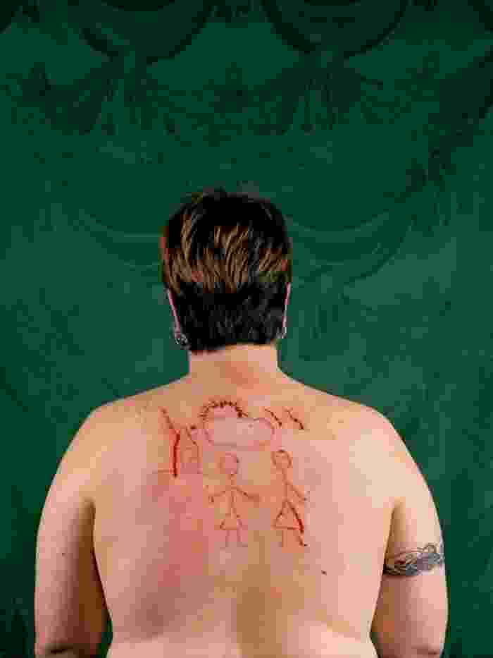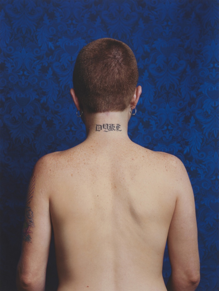 “Self Portrait/Cutting” (1993) is one of Opie’s most dramatic and disturbing works. The image shows Catherine’s back, with a childlike drawing etched into her skin of two skirted figures holding hands in front of a house. The contrast between the childlike drawing and the cut in her skin refers to the painful tension in queer people’s relationship with family: societal judgment, exclusion, or inner conflicts, while also symbolizing resistance to these struggles. It also reflects what we all have in common: the desire for a loving family.