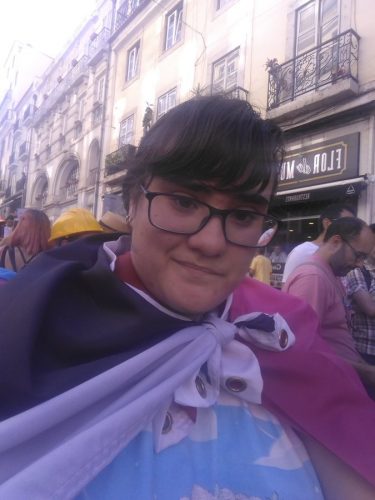 Amennyire csak tudok, aktívan részt veszek a portugál LMBTQIA+/queer mozgalomban, különösen az aszexuális és aromantikus közösségekben. Annak ellenére, hogy az aszexualitás és az aromantikusság a fő területei közösségi munkámnak, a saját identitásomat leginkább “leszbikus”-ként határozom meg. Nagyon nyitott vagyok az orientációmmal kapcsolatban, és nemcsak azért, mert hű akarok lenni önmagamhoz és őszinte másokkal, hanem azért is, mert ez egy politikai szembeszállás is a patriarchális társadalommal szemben. Azt gondolom, hogy a nőgyűlölő és transzellenes hozzáállás annyira elterjedt, hogy az emberek már észre sem veszik. Ezért fontos, hogy magamat határozottan és nyíltan ezzel szemben definiáljam -- hiszen nagyon nem tartom rendben levőnek a cisz-hetero-mono-normatív társadalmi felfogást.